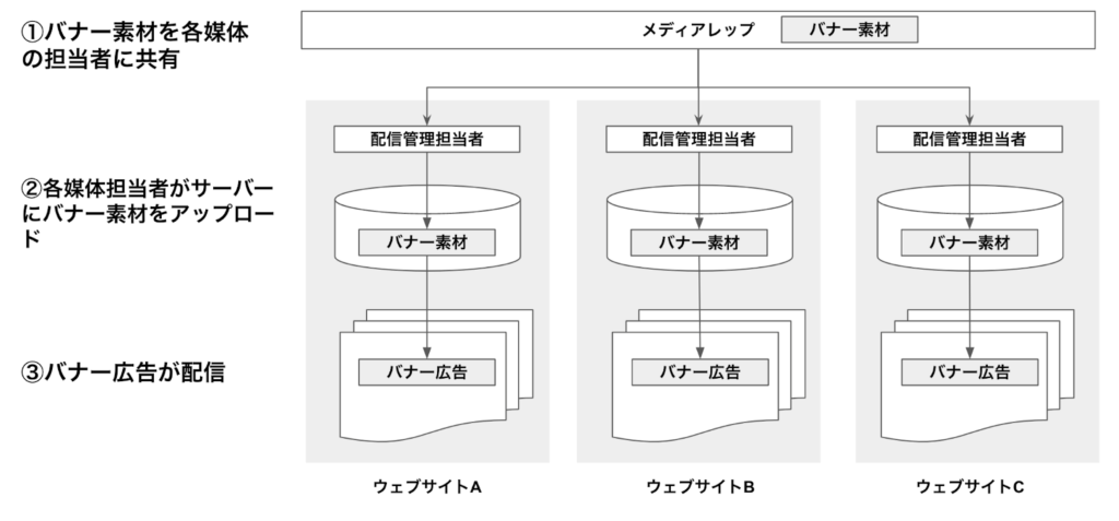 インターネット広告黎明期の広告配信はとてもアナログで、下の図のようにメディアレップが広告主や広告代理店からバナー広告に使用する画像を受け取ると、各ウェブサイトの担当者に渡し、各ウェブサイトの担当者がサーバーにアップロードして広告の配信を行っていました。第10話、第11話で、ウェブサイトの数が増えてくるにしたがって、この作業がいかに煩雑になっていったかを見てきました。