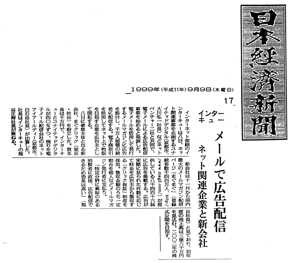 1999年の初夏、ビットバレー1番乗りでJASDAQ店頭公開直前となっていたインターキューの熊谷さんから、1千万部配信に到達するウイークリーまぐまぐ中面の5行広告と、配信するメールマガジン本文中に貼るクリック保証型5行広告を専門に取り扱うまぐまぐ広告の総代理店「まぐクリック」の設立合意を聞かされました。「メール広告の市場はまだまだ伸びる。多くのネット系新興企業が上場する。株式市場は実績よりも成長性を優先する。」という彼の近未来予測には、僕も同感でした。
