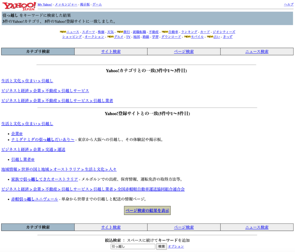 Yahoo! JAPANで「引っ越し」と検索した時の「ディレクトリ型」検索エンジンの検索結果(1997年1月)