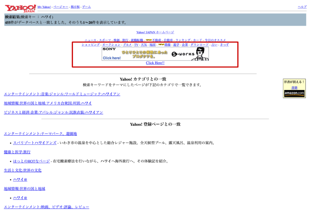 1997年1月のYahoo! JAPANで「ハワイ」と検索した時の検索結果に表示された「サーチワード広告」