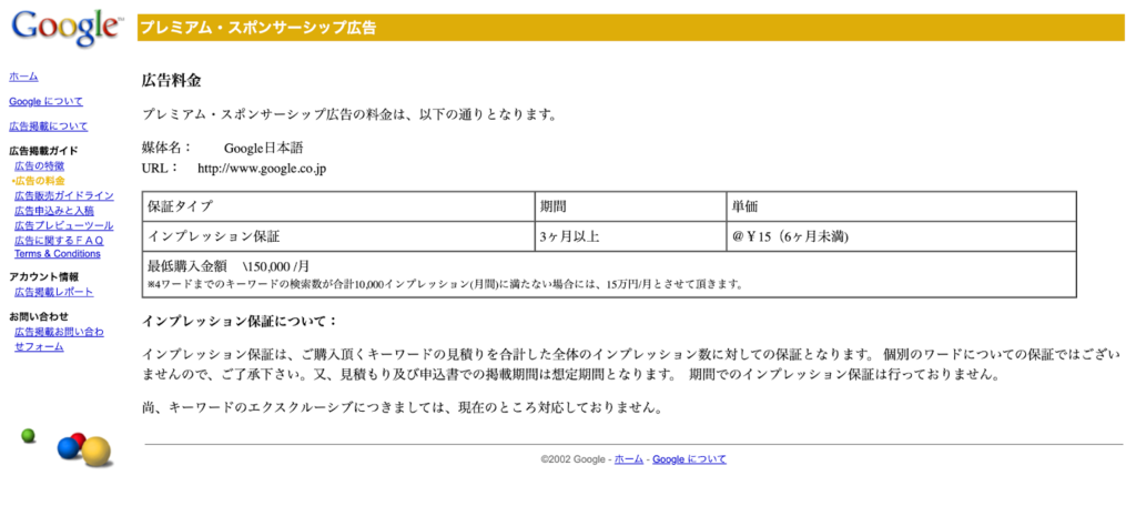 2002年3月にGoogleの「広告掲載について」に掲載された「プレミアム・スポンサーシップ広告」のサンプル