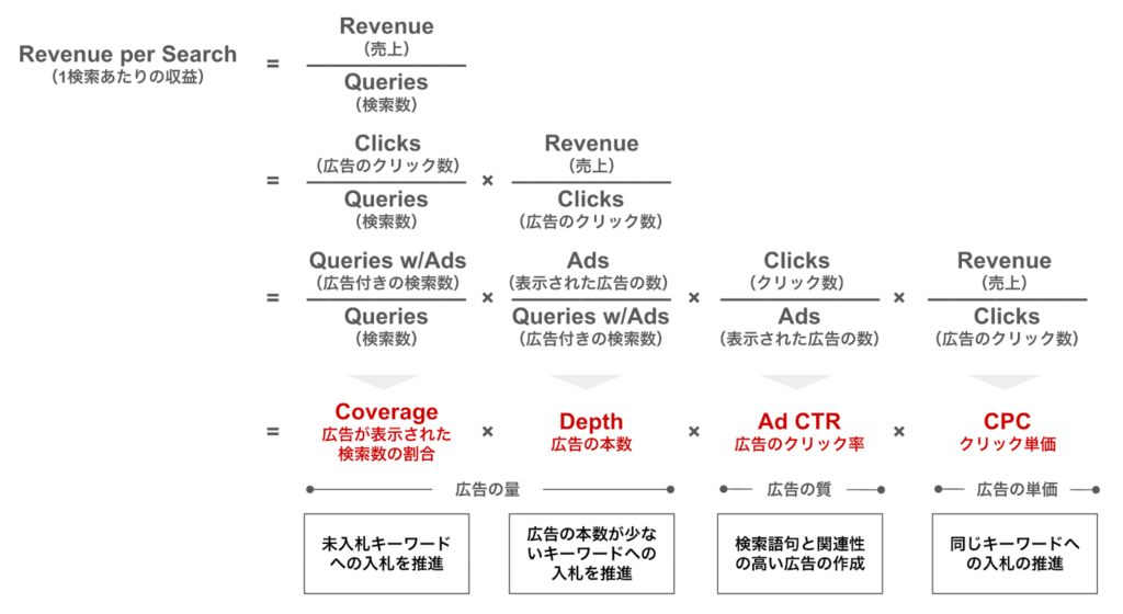 この表で、一番下の「カバレッジ」(英語の「Coverage」)が変数の一つとして登場していますが、1検索あたりの収益を上げるには「カバレッジ」を増やしていくことが重要でした。すべての検索数に対して広告が表示された検索数の割合のことを「カバレッジ」と呼ぶのですが、この「カバレッジ」が思うように上がっていかなかったんです。