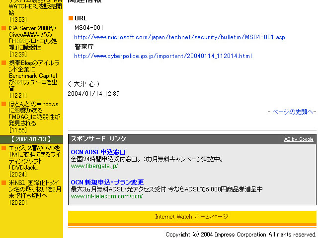 出典:Internet Watch「Google、サイト向け広告配信プログラム「AdSense」の日本提供を公式発表」(2004年1月14日付)