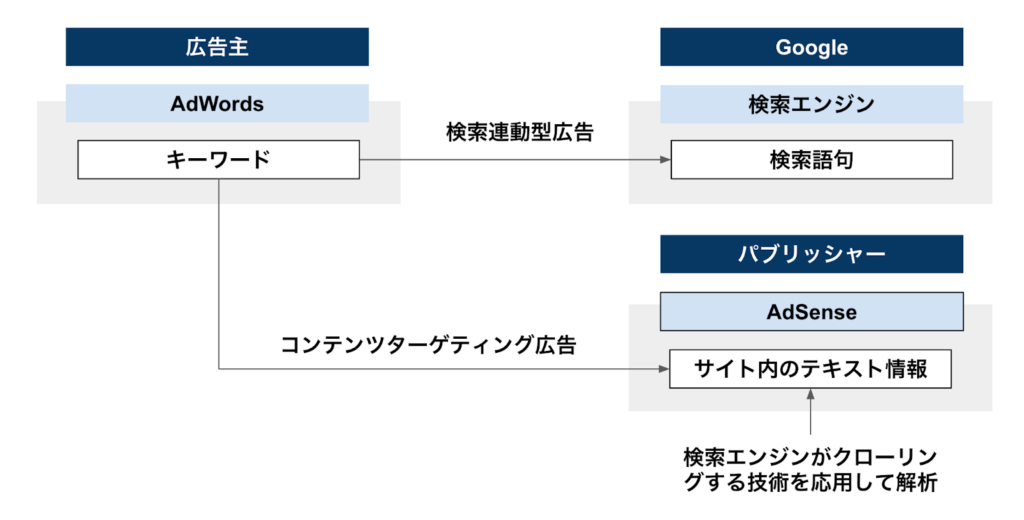 Googleの検索エンジンは「クローラー」(第18話参照)と呼ばれるロボットが世界中のウェブサイトのリンク構造を辿って各ウェブページを「インデックス化」(データベース化)しているのですが、この過程で各ウェブページのテキスト情報を読み込んでいます。この技術を広告用途に転用して各ウェブページのコンテンツの内容を解析し、広告主がターゲティングできるように整理しているのがAdSenseです。AdSenseの広告枠が貼られているウェブサイトを総称して「Google コンテンツネットワーク」と呼びました。現在の「Google ディスプレイネットワーク」の前身です。
