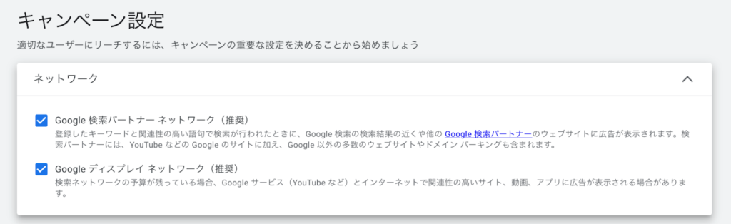 現在のGoogle広告の検索広告のキャンペーン設定画面で「Google ディスプレイネットワーク」(AdSenseへの配信)がデフォルトでONになっているのが確認できる