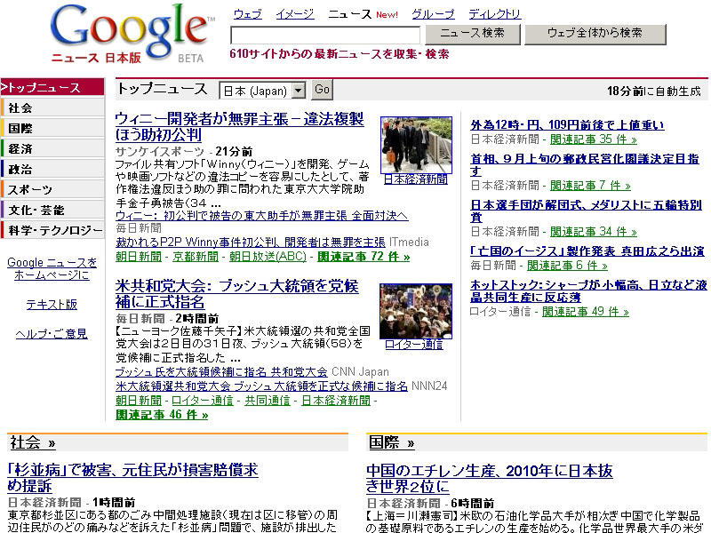 出典:Internet Watch「Googleニュース」が日本でもスタート~ニュースソースは600サイト以上」(2004年9月