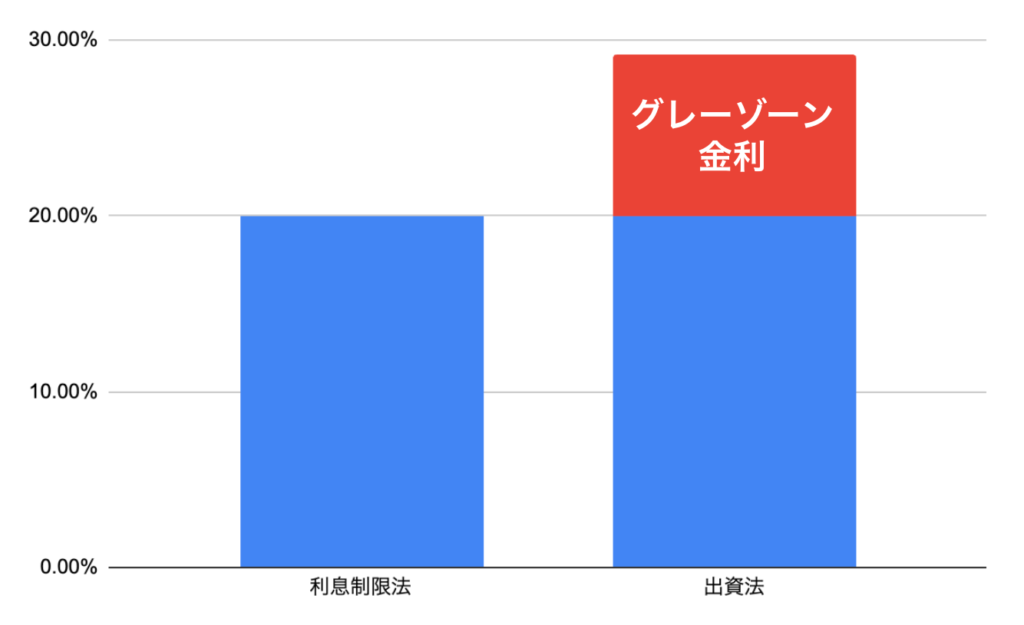 「グレーゾーン金利」とは、「利息制限法」が設定する上限金利15〜20%と、「出資法」が設定する上限29.2%の間の金利のことで、消費者金融業者の多くが「出資法」を根拠に20%以上の金利を設定していました。