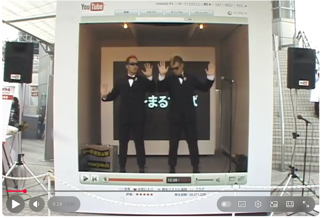 平山:当時は今のようにYouTuberが多くなかったので、YouTubeに動画をアップロードしてもらうこと自体を啓蒙する必要がありました。2007年12月28日(金)~30日(日)の3日間、渋谷の109の前にYouTubeの動画をモチーフにしたステージを作って「YouTubeネタバトル」というイベントを開催しました。なぜか僕が司会をするはめになったのですが、その時の動画が下の動画です。当時人気だったパントマイムユニットの「が~まるちょば」さんなどにご登場いただきました。