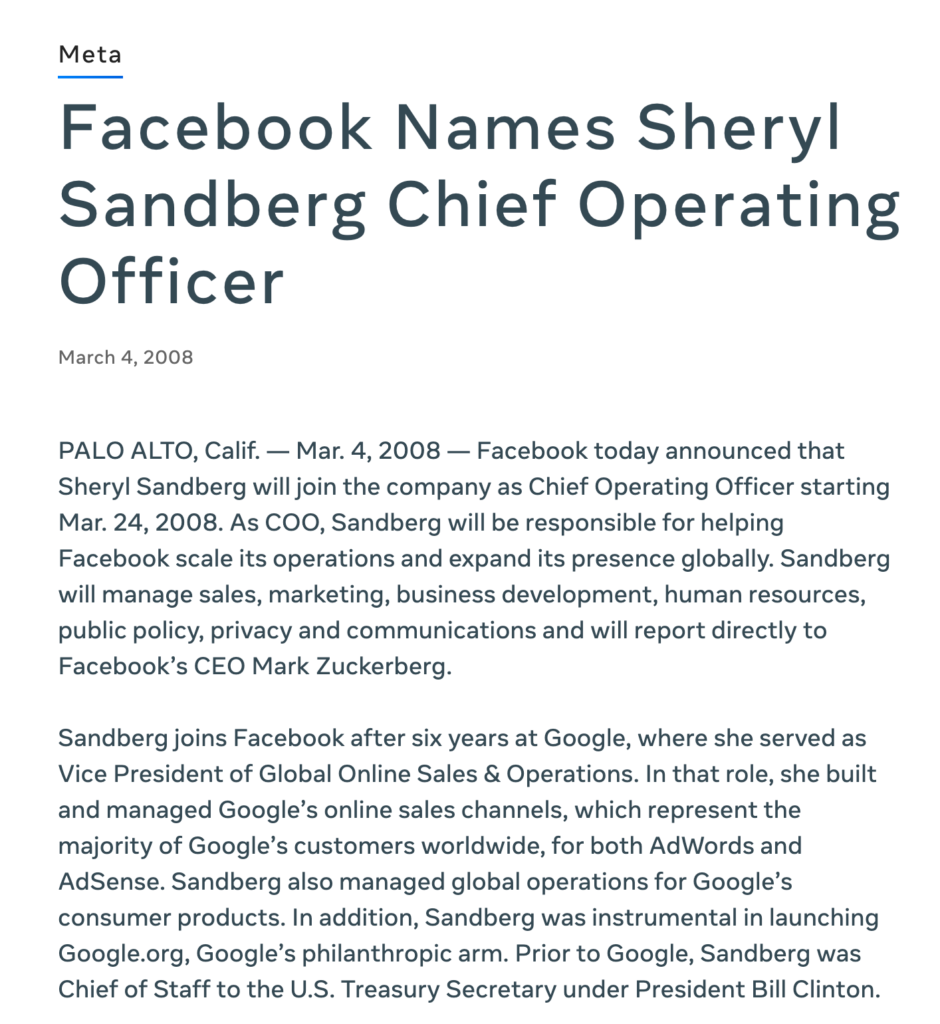 出典:Meta Newsroom「Facebook Names Sheryl Sandberg Chief Operating Officer」(2008年3月4日付け)