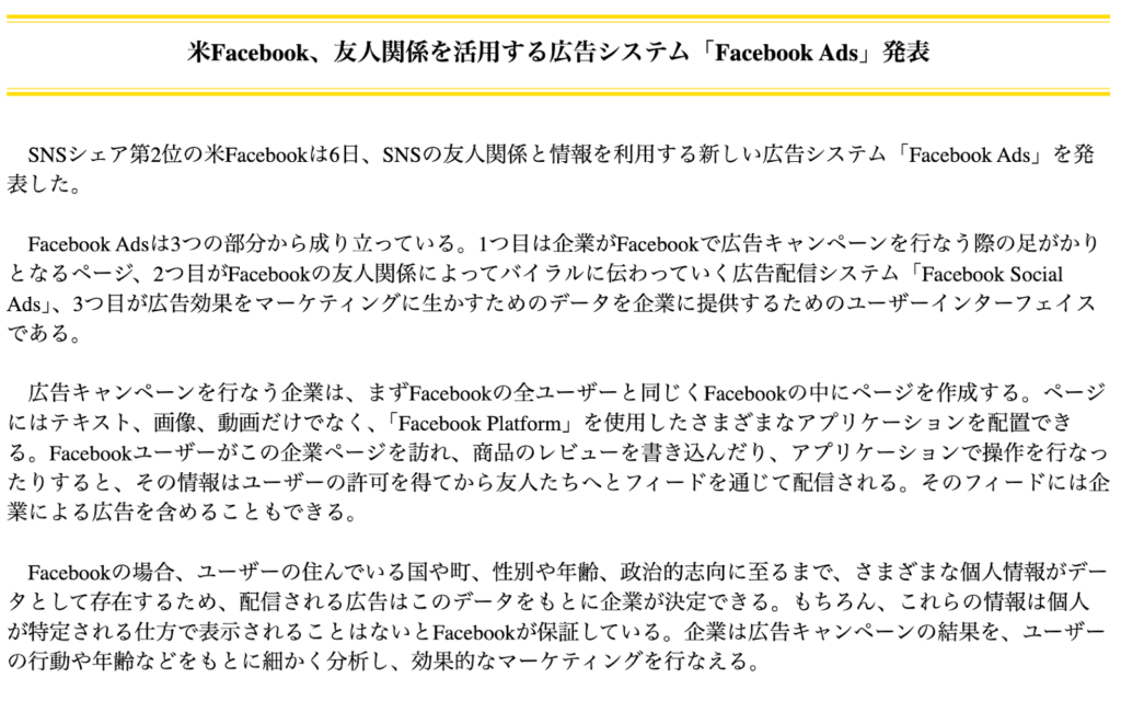 「Facebook Ads」が発表された時のニュース記事
