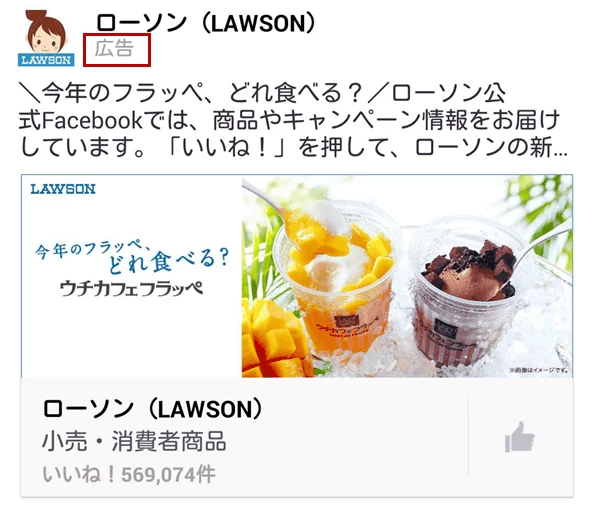 2017年にスマートフォンに表示されたローソンの「Page Likes Ad」(「いいね!広告」)