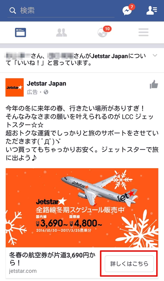 2017年にスマートフォンに表示されたJetstarの「Page Post Ad」(「投稿の宣伝」)