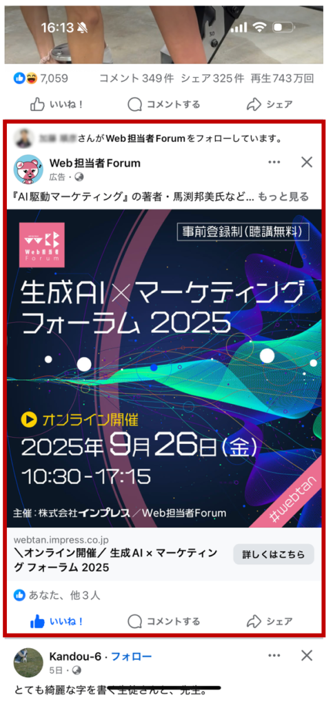 現在のニュースフィード内に表示されるFacebookの広告(現Meta広告)