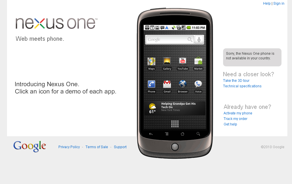 Googleが初めて発売したスマートフォン「Nexus One」(HTC製)の紹介ページ