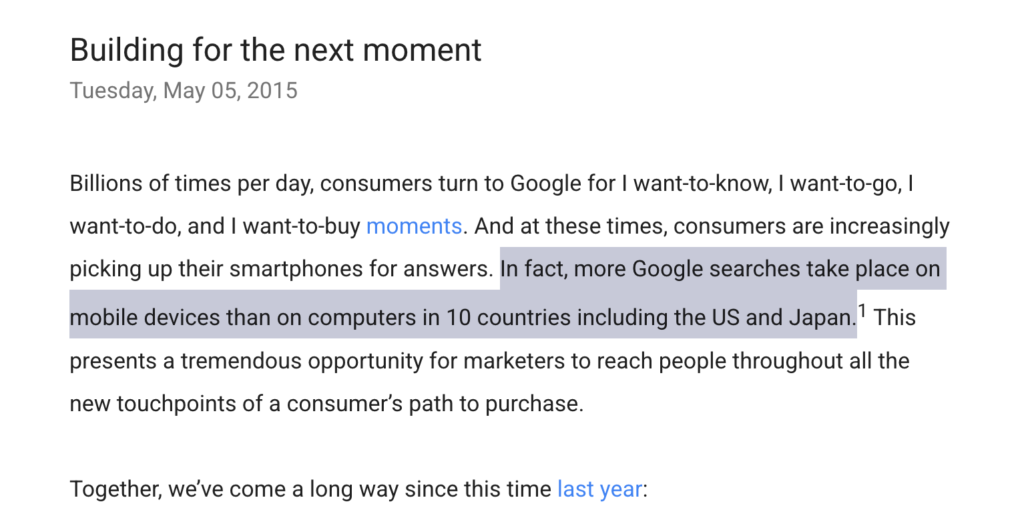 2015年5月、Googleは米国と日本を含む10カ国におけるスマートフォンのGoogleの検索数がデスクトップPCの検索数を上回ったことを発表しました。