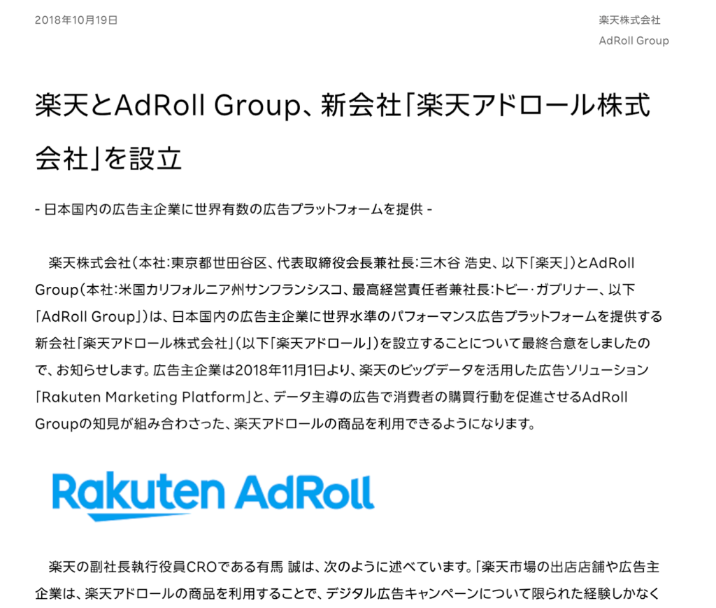 出典:楽天プレスリリース「楽天とAdRoll Group、新会社『楽天アドロール株式会社』を設立」(2018年10月19日付け)